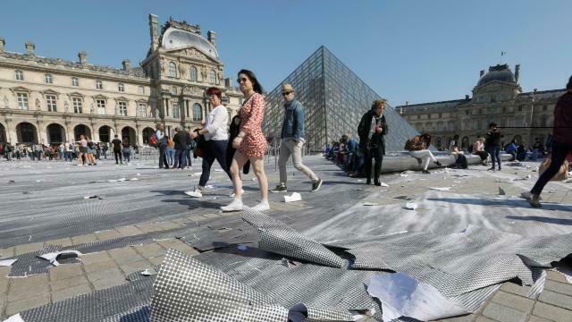 Sitôt collée, sitôt abîmée : la saisissante œuvre en trompe-l’œil de JR autour de la Pyramide du Louvre aura duré quelques heures. L’artiste publie ce dimanche un message sur Twitter, justifiant la rapide dégradation par l’effet du soleil et des pas des piétons.